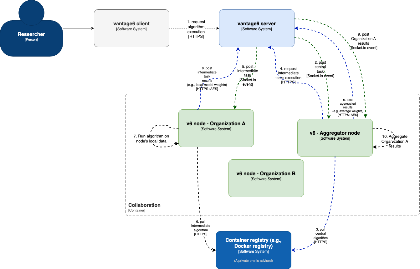 The steps above do not mention many security considerations involved in the process (these are addressed in the Risks section). However, it is worth noticing that in the default vantage6 architecture, the nodes (where the datasets reside) only perform outbound communications to the server. That is to say, there is no need to open any kind of port where data resides.